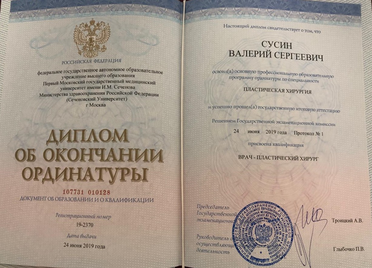 2019 г. — ординатура по специальности «Пластическая хирургия», Первый Московский государственный медицинский университет имени И. М. Сеченова, университетская клиническая больница № 1 (Первый МГМУ им. И. М. Сеченова, УКБ № 1)