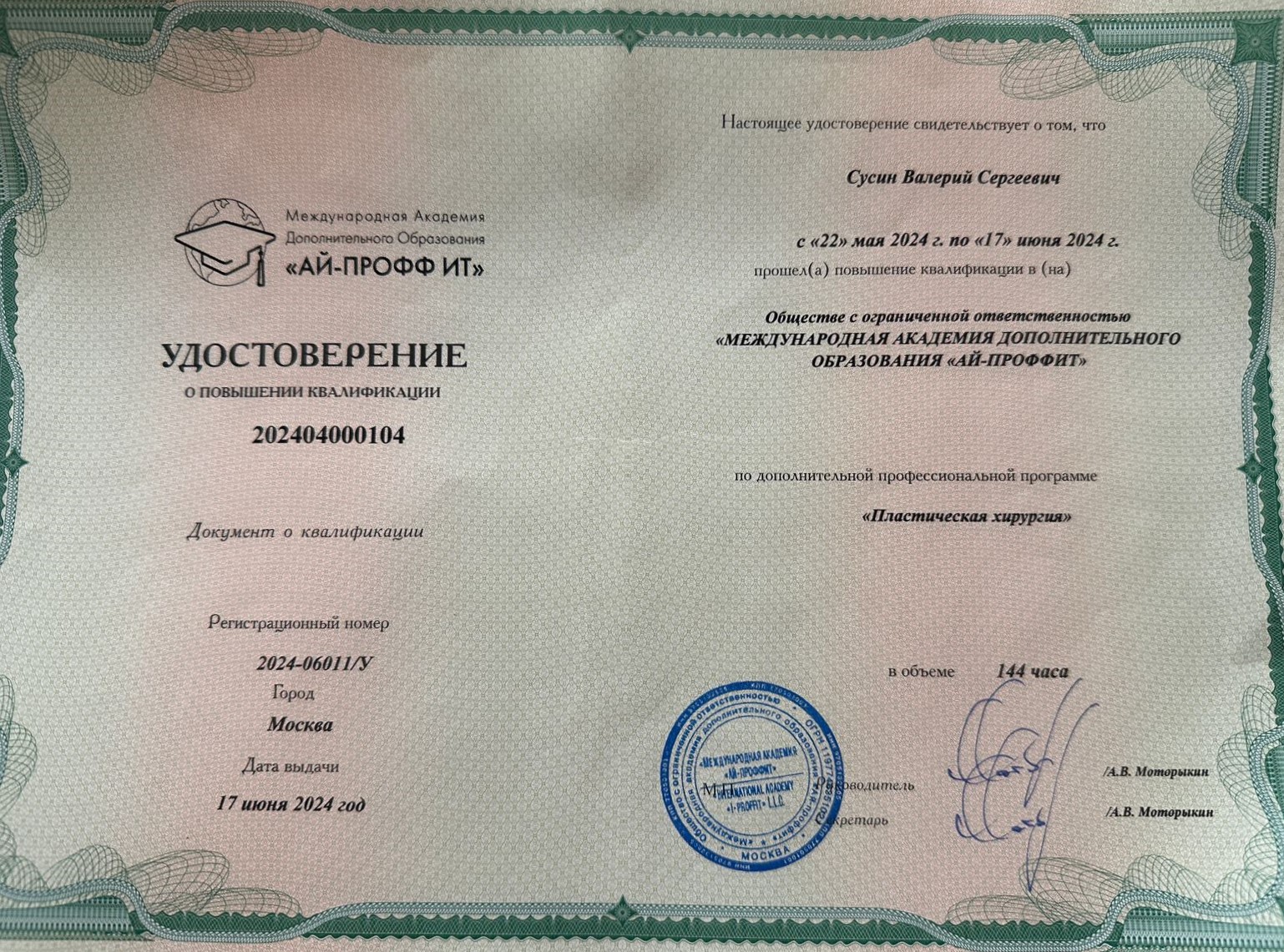 Июнь 2025 г. — стажировка в Национальном институте имени королевы Елены, отделение пластической и реконструктивной хирургии (Рим, Италия)